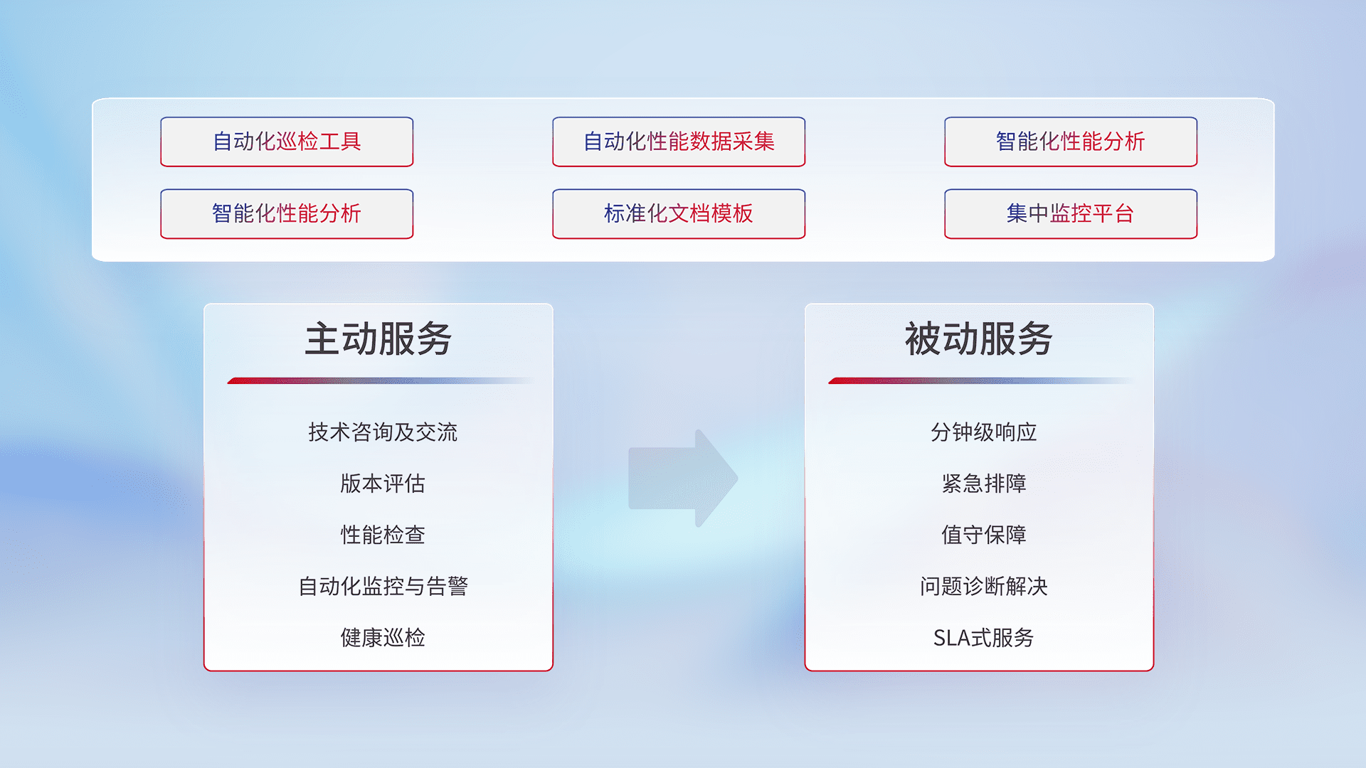 智能化工具和标准化文档,,,,保障服务质量,,提供主动服务(包含技术咨询、、版本评估、、、、性能检查、、、自动化监控与告警、、、、健康巡检)和被动服务包含(分钟级响应、、、紧急排障、、值守保障、、问题诊断解决、、、、SLA服务)。。